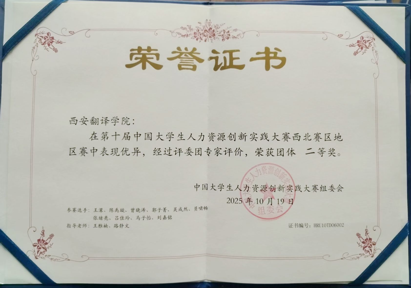 近日,第十届中国大学生人力资源创新实践大赛(西北赛区)圆满落幕。我校学子荣获团体二等奖,彰显了西译人力资源管理专业的实践教学成果与人才培养成效。