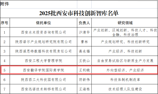 10月20日,西安市科学技术局发布的《关于确定2025批西安市科技创新智库的通知》正式公示结果(https://www.xatrm.com/qttz/328812.jhtml),经研究确定40家依托单位为2025批西安市科技创新智库。由国际商学院报送的“内陆口岸经济与运营研究智库”成功入选,凸显了我校在深入实施创新驱动发展战略、统筹智力资源,更好服务市委、市政府乃至全省科技创新建言献策方面的支撑作用。
