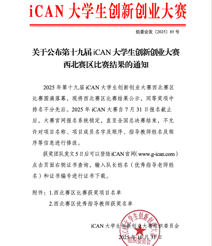 作为备受瞩目的国家级创新创业盛会,iCAN大赛始终致力于激发大学生的创新潜能与创业活力。本次区域赛竞争空前激烈,西安交通大学、西北工业大学等众多高校团队参与。我校参赛团队在指导教师的精心指导下,反复打磨项目方案,全力备战。决赛现场,他们以深厚的专业积淀、缜密的逻辑阐述及前瞻性的项目创意,赢得评审委员会的高度赞誉。此次获奖不仅是对团队成员与指导教师辛勤耕耘的充分肯定,更是我校持续深化创新创业教育改革、着力培养学生创新精神与实践能力的集中展现。