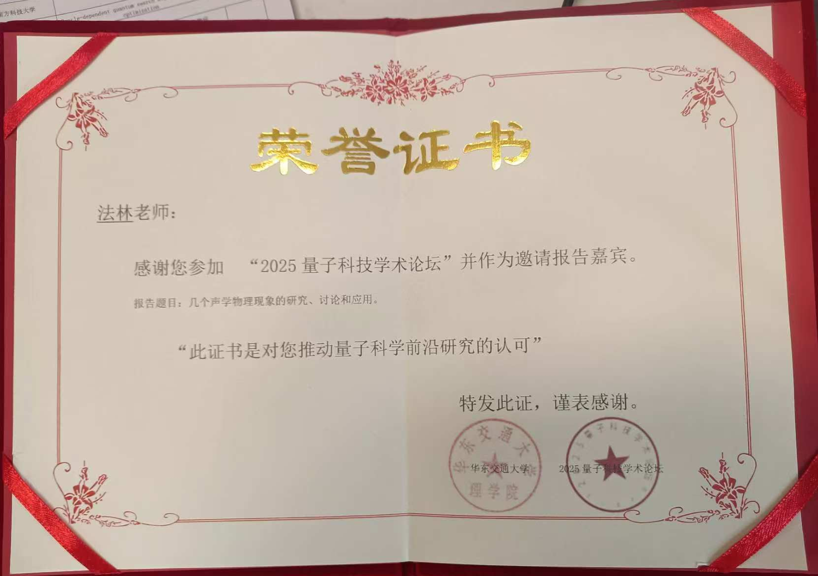 论坛上,法林教授以《几个声学物理现象的研究、讨论和应用》为题,从物理声学视角出发,探讨了相关基础研究及其技术应用,其跨学科的思维方法与扎实的研究成果,在与会专家中引起了积极关注与讨论。此次高水平学术交流,是我校鼓励教师紧跟学术前沿、积极参与国内外高水平对话的成果体现。