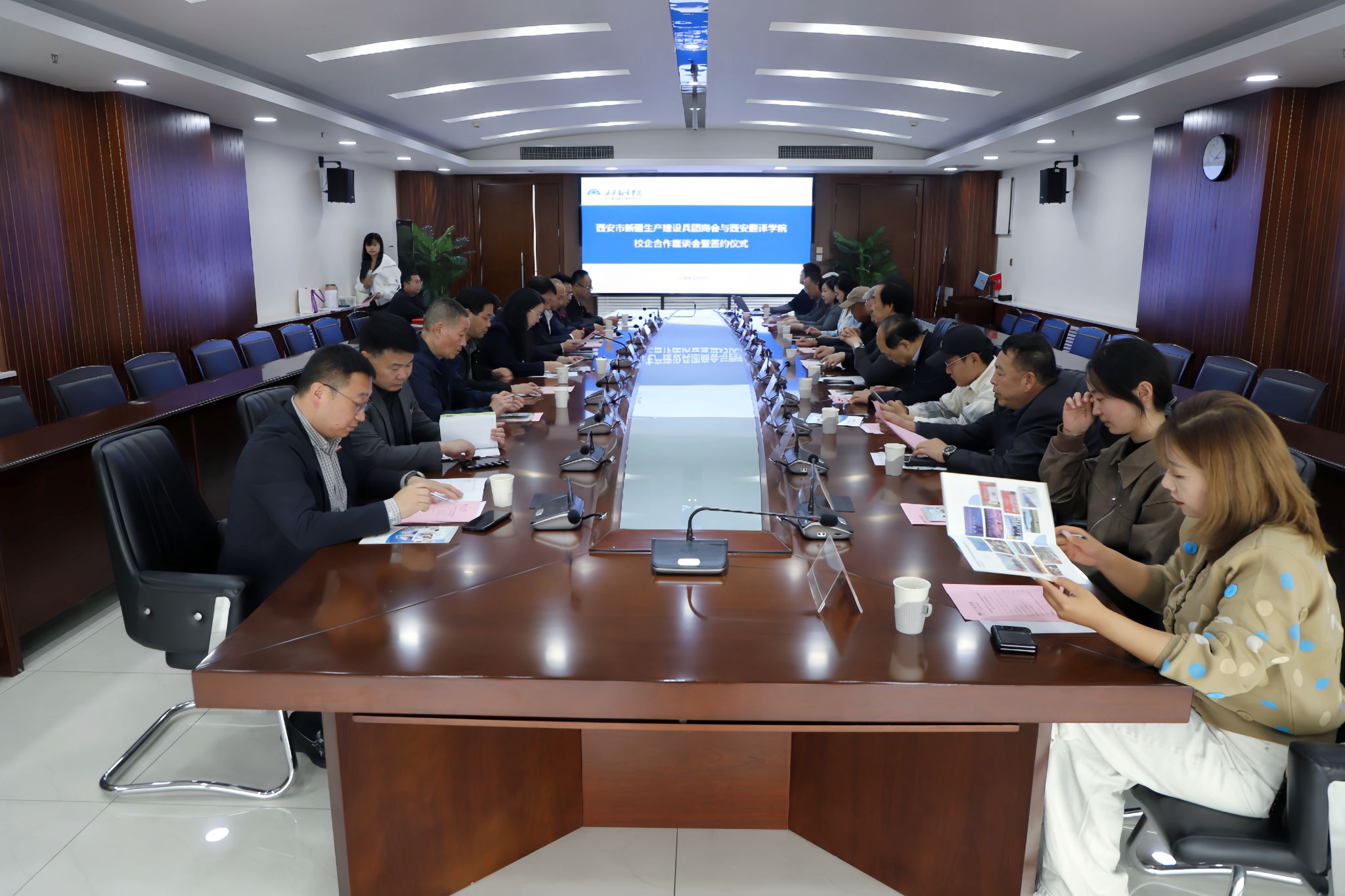 签约后,双方围绕招生就业、实习实训、人才培养、产业合作等议题展开深入交流。企业家代表分别介绍了各自企业情况与合作意向;学校招生处、译创大学园区、继续教育学院、国际语言文化学院、人文与艺术学部等相关单位负责人及教师代表就新疆招生计划、小语种人才培养、企业培训项目等具体事宜进行了对接。