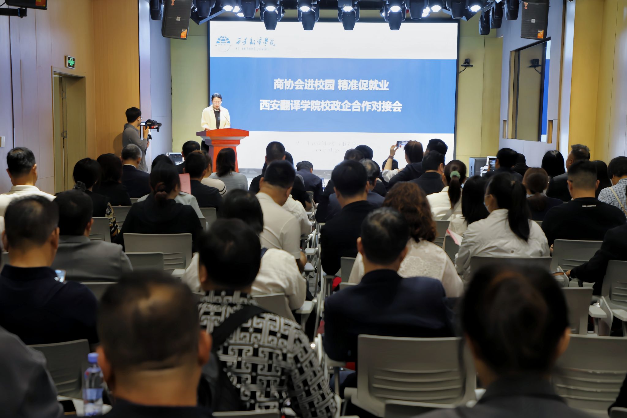 为深入贯彻落实国家关于促进高校毕业生就业工作的决策部署,积极搭建校政企精准对接平台,4月28日下午,西安翻译学院举办“商协会进校园 精准促就业”校政企合作对接会,西安市工商联党组成员、副主席刘宝,西安市工商联联络处处长李积红,西安翻译学院副校长王霖等校领导,以及来自全市21家商协会的会长、秘书长、企业家代表共同出席。学校相关职能部门、各学部负责人及专业教师代表参加活动。