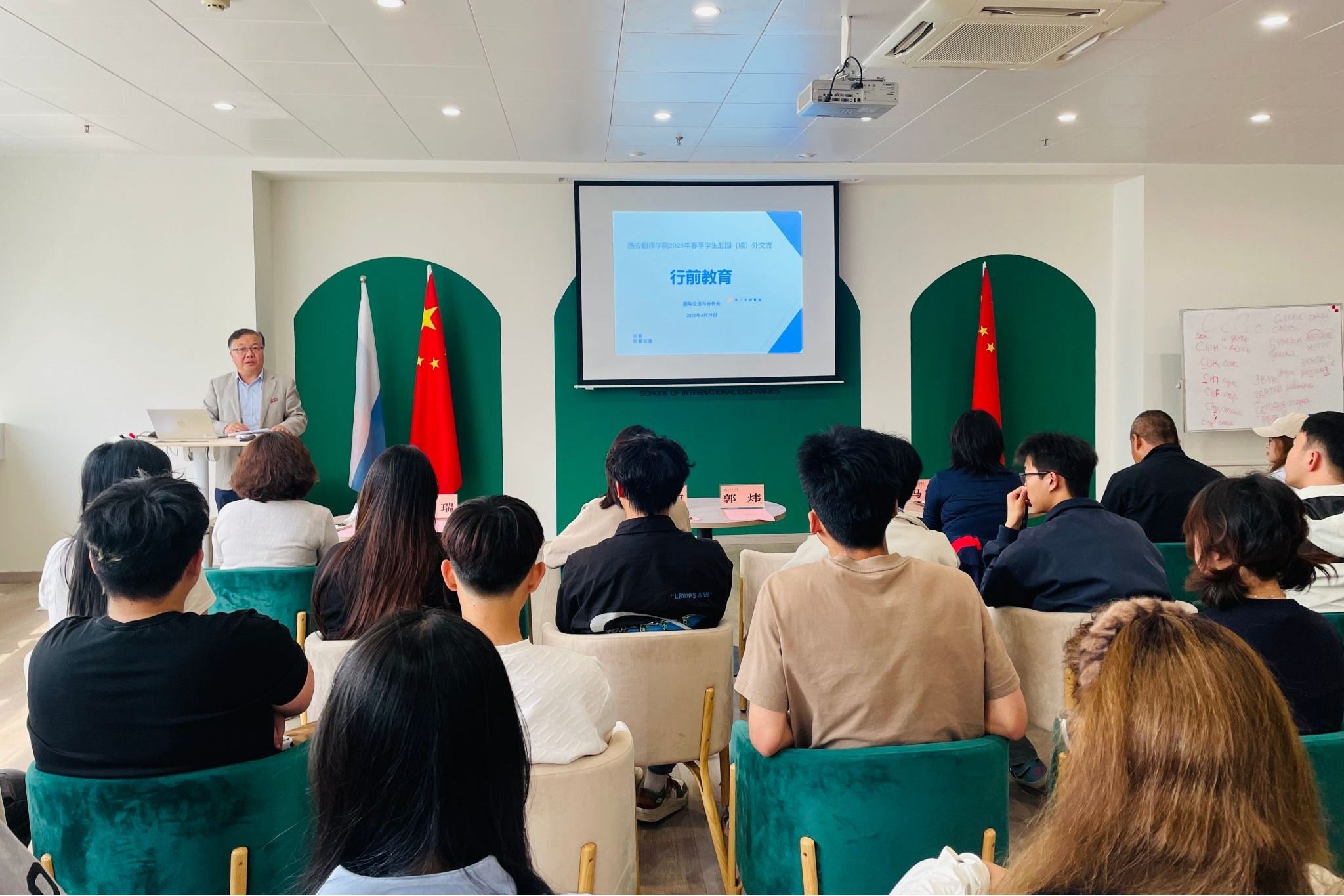 4月29日下午,2026年春季学生赴国(境)外交流行前教育会顺利举行。副校长郭炜、国际交流与合作处处长王明明、人文与艺术学部带队教师王钰莹、经济与管理学部带队教师马桢、英文学院带队教师党建雄、国际语言文化学院教师代表蒋敏及国际处相关业务负责人出席会议,王明明主持。