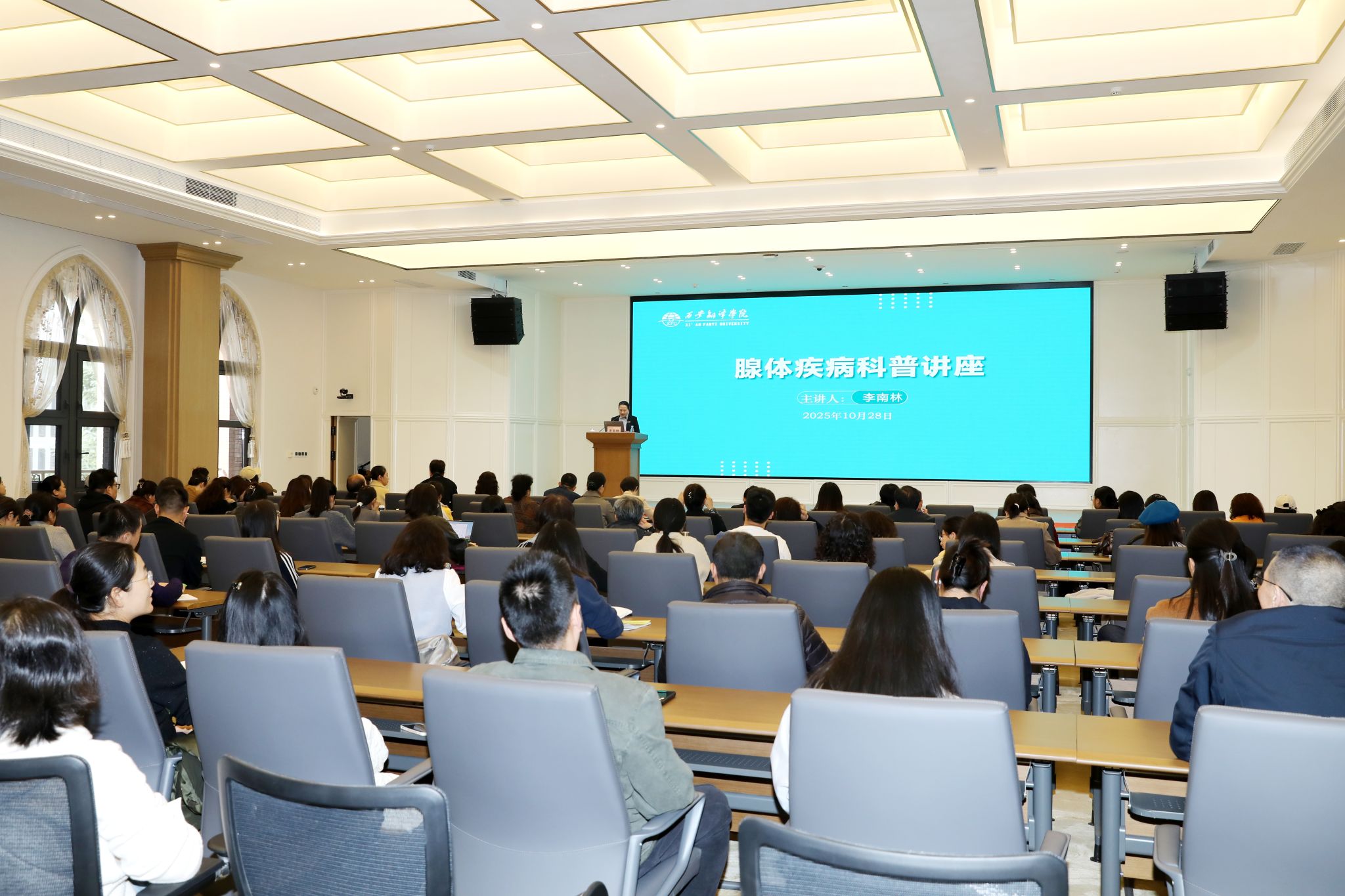10月28日,腺体疾病科普讲座在我校祖诒国际学术交流中心举办,特邀陕西省健康科普专家、西京医院李南林副教授主讲。理事长丁晶,部分二级学院领导、教职工代表及护理与康复学院师生代表参加。党委副书记、工会主席王小惠主持。