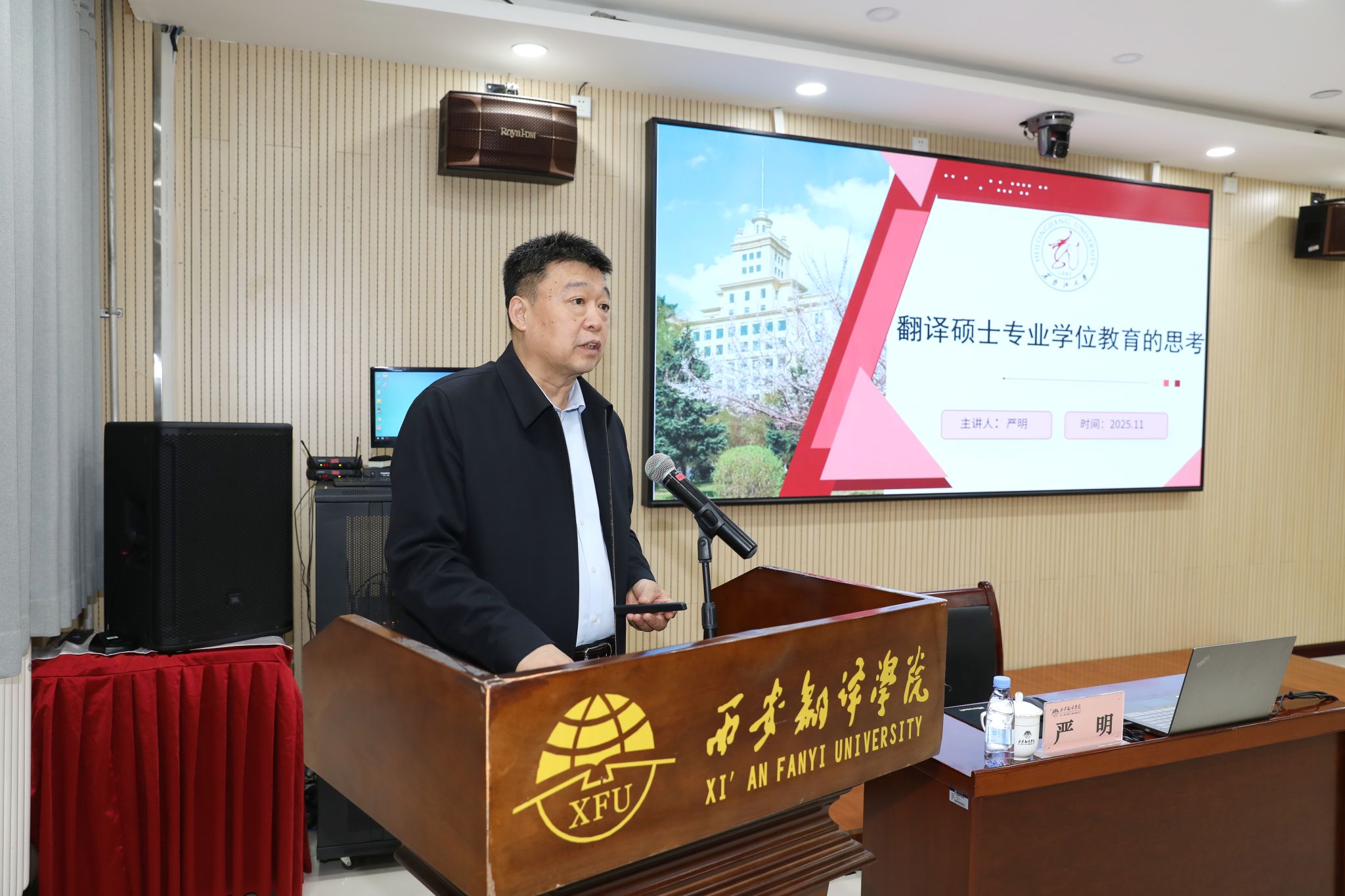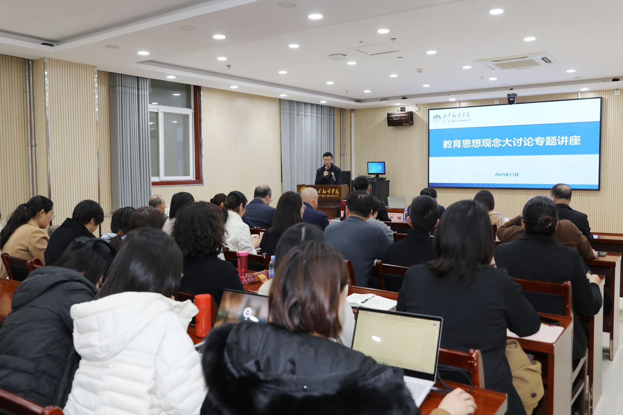 11月19日,西安翻译学院启动第五期教育思想观念大讨论。黑龙江大学原副校长严明受邀作《翻译硕士专业学位教育的思考》报告。校长姚书志及相关校领导、部分二级学院及职能处室负责人、科研处全体人员、教师代表听取报告并互动交流。副校长武忠远主持。
