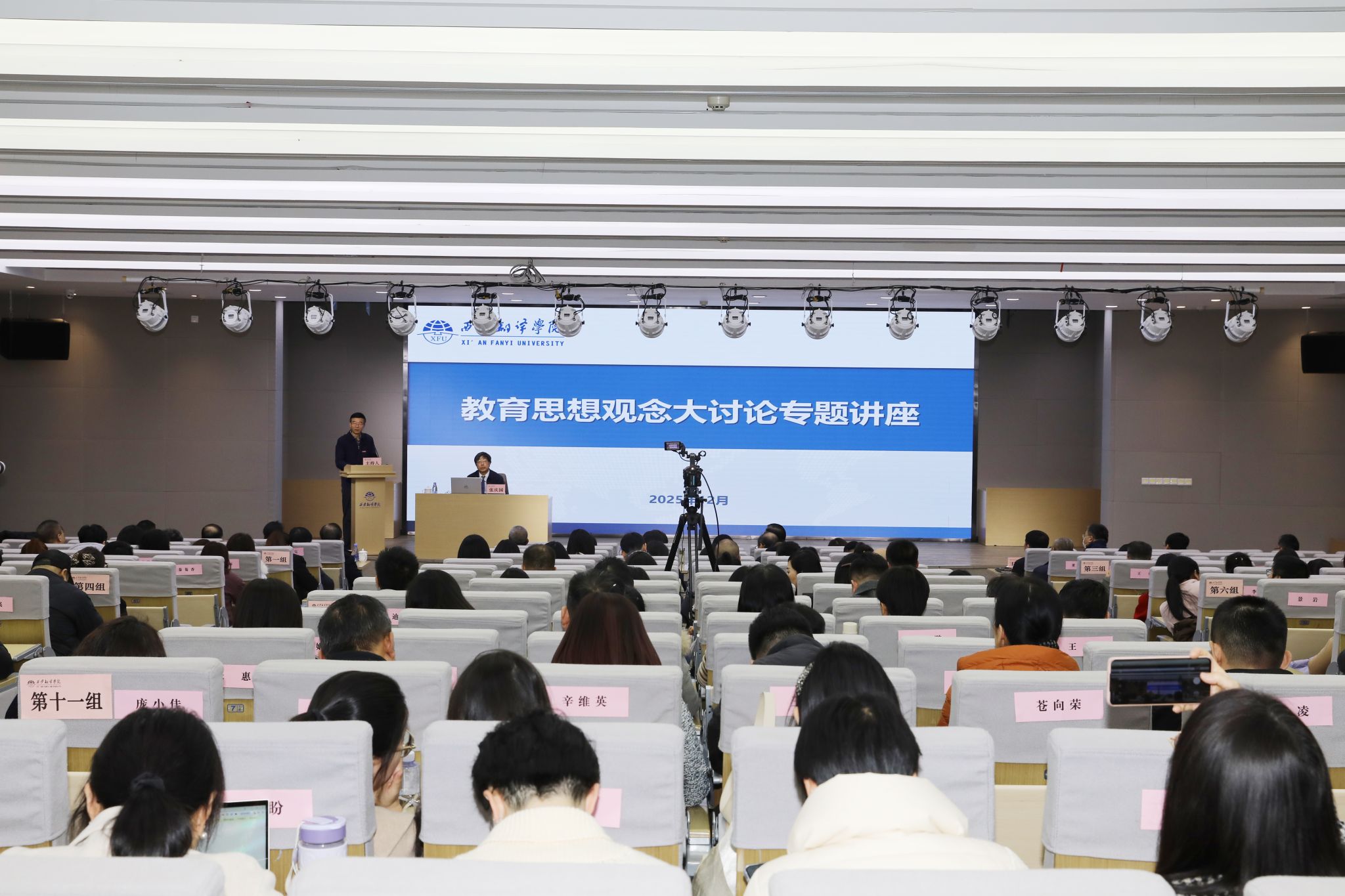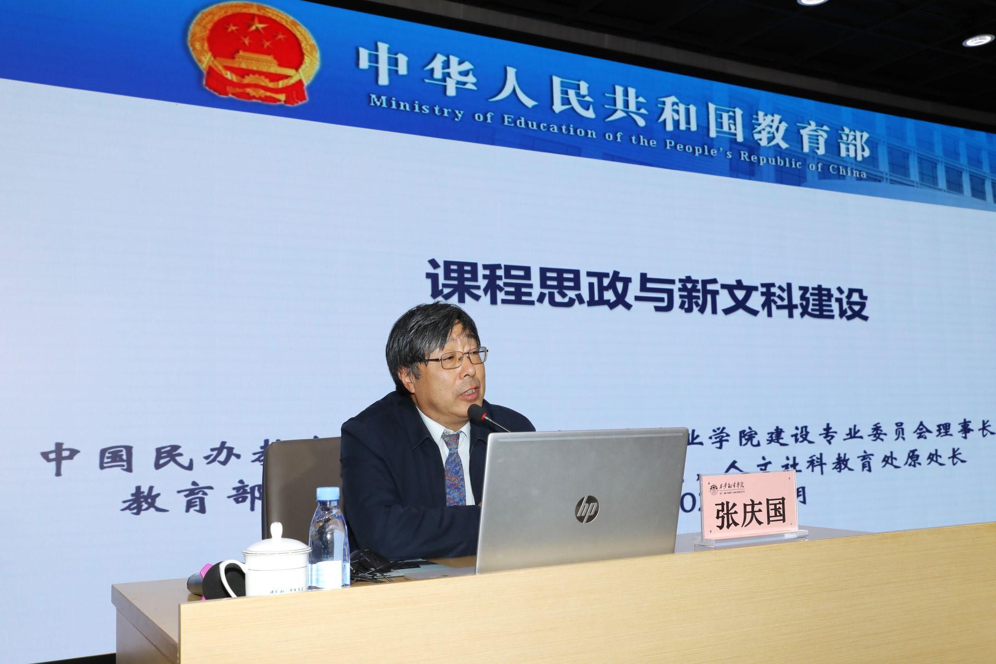 12月1日,西安翻译学院启动第七期教育思想观念大讨论。中国民办教育协会信息技术现代产业学院建设专业委员会理事长、原教育部高等教育司二级巡视员、原人文社科教育处处长张庆国受邀作《课程思政和新文科改革的实践与思考》报告。理事长丁晶、校长姚书志及全体校领导、各二级学院和职能处室科级以上干部、教师代表听取报告。副校长武忠远主持。