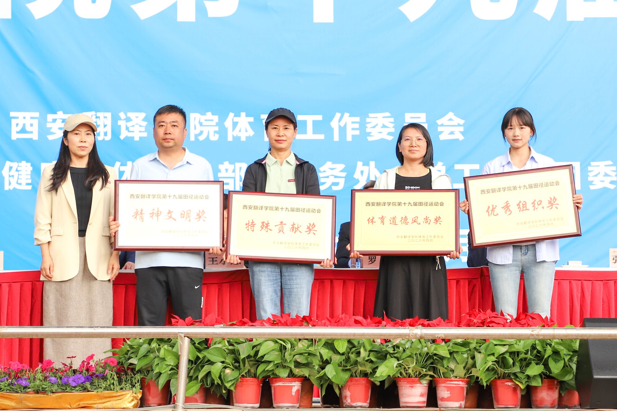 4月24日下午,经过为期两天紧张激烈的比赛,西安翻译学院第十九届田径运动会圆满闭幕。校长罗云,副校长武忠远,党委副书记王小惠,党委副书记、副校长张恒,副校长樊相宇,工会主席赵驿梅及各学部(院)、职能处室负责人出席。各二级学部(院)师生代表、运动员代表参加闭幕式。教务处副处长孙晓辉主持闭幕式。