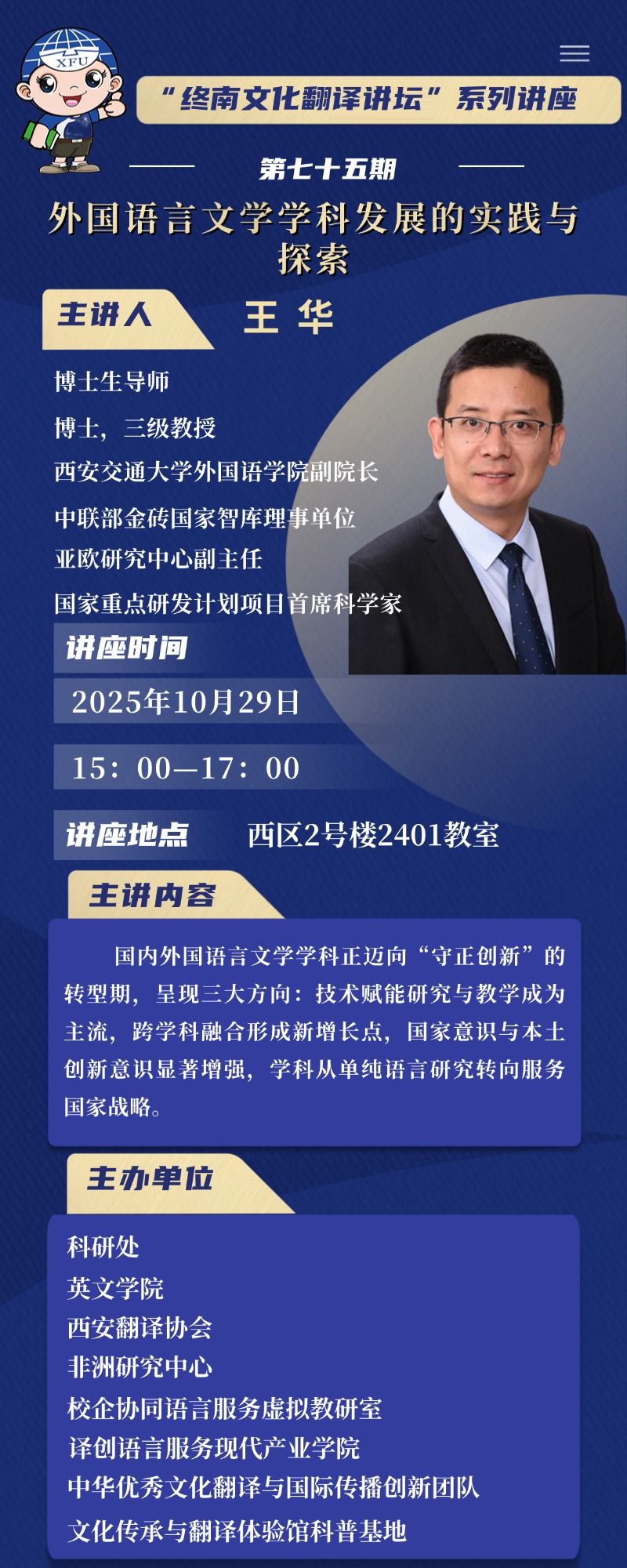 【学术讲座预告】“终南文化翻译讲坛”系列讲座第七十五期——外国语言文学学科发展的实践与探索
