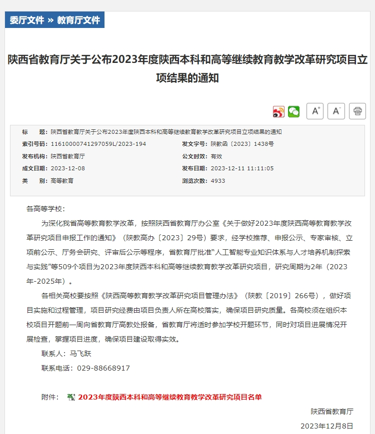 近日,陕西省教育厅办公室发布《关于公布2023年度陕西本科和高等继续教育教学改革研究项目立项结果的通知》(陕教函〔2023〕1438号),我校有7个项目获批立项,其中重点攻关项目1项,重点项目(含青年专项)3项和一般项目3项。此次我校省级教改立项数量和质量在同类民办院校中双双排名第一。