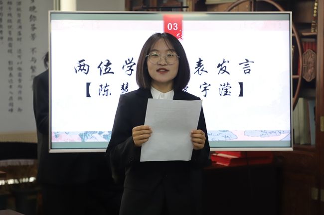 接下来,两位优秀学员代表分别讲述了自己在写作班的收获与成长。陈慧子同学借用曹操的诗作《观沧海》表达了自己对文学的执着与壮志,希望同学们也能够拥有这样博大的情怀与志向,将文学贯彻于生命长河之中。李宇滢同学表明自己在这里学会了独立思考,学会了一往无前,更学会了追逐梦想。
