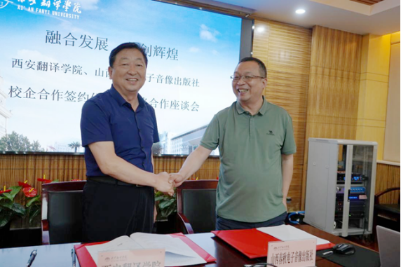 6月21日下午,山西春秋电子音像出版社与西安翻译学院校企合作签约仪式暨战略合作座谈会在科技楼举行。山西春秋电子音像出版社社长兼总编辑裴建平、重大项目部主任张熔、山西出版传媒集团融合发展部主任赵璐、山西科技出版社副总编辑宋伟、山西春秋电子音像出版社新媒体出版部主任董晓宁出席座谈会;我校副校长齐玉水,文学与传媒学院院长亢西民、副院长刘杨,陕西非遗研究院常务副院长王海珺、少数民族研究中心主任李强及相关专业系主任、部分专业老师参加了本次签约仪式及座谈会。