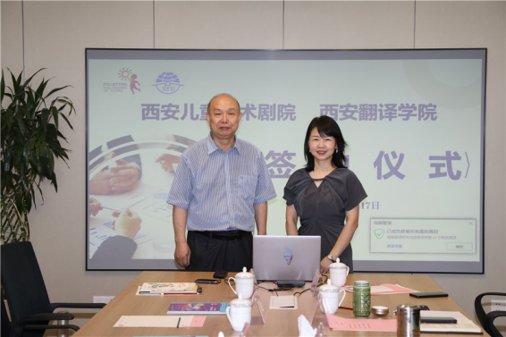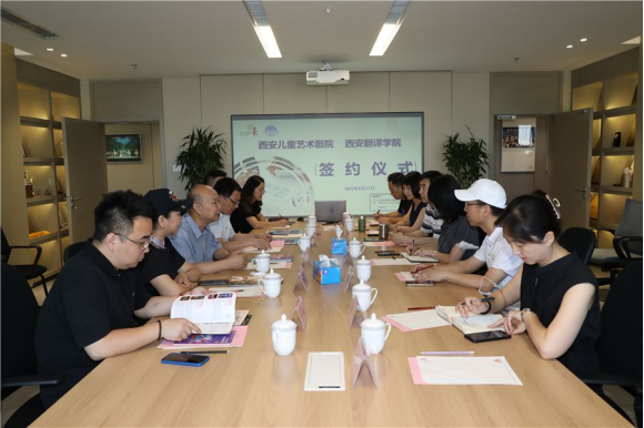 6月17日上午,西安翻译学院与西安儿童艺术剧院校企合作签约仪式在曲江演艺大厦举行。西安演艺集团总经理助理,西安儿童艺术剧院书记、总经理王丽虹,西安儿童艺术剧院业务副总经理宣亦斌,我校文学与传媒学院院长亢西民、副院长李绍先、表演专业荣誉教授梁丽等出席活动。