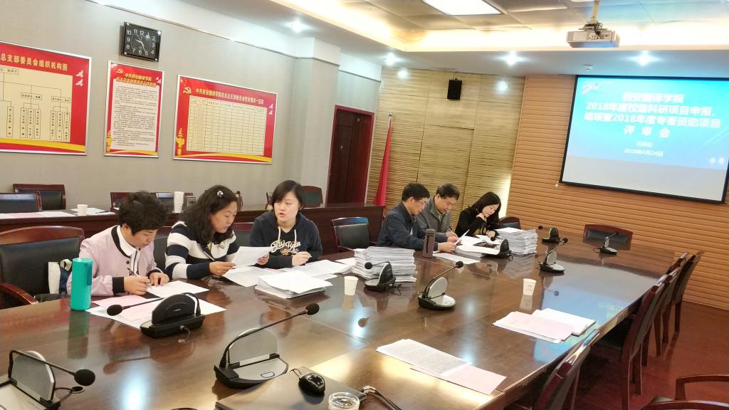 根据我校2018年度科研工作安排,科研处于4月24日上午9:00在东区科技楼三楼小会议室组织召开了“西安翻译学院2018年度校级科研项目结题、立项暨学术著作出版资助项目评审会”。会议由科研处副处长王利晓主持,常务副校长翟振东、校长助理梁明等评审专家组成员及科研处全体人员出席会议,翟振东担任学术委员会委托的评审组组长。
