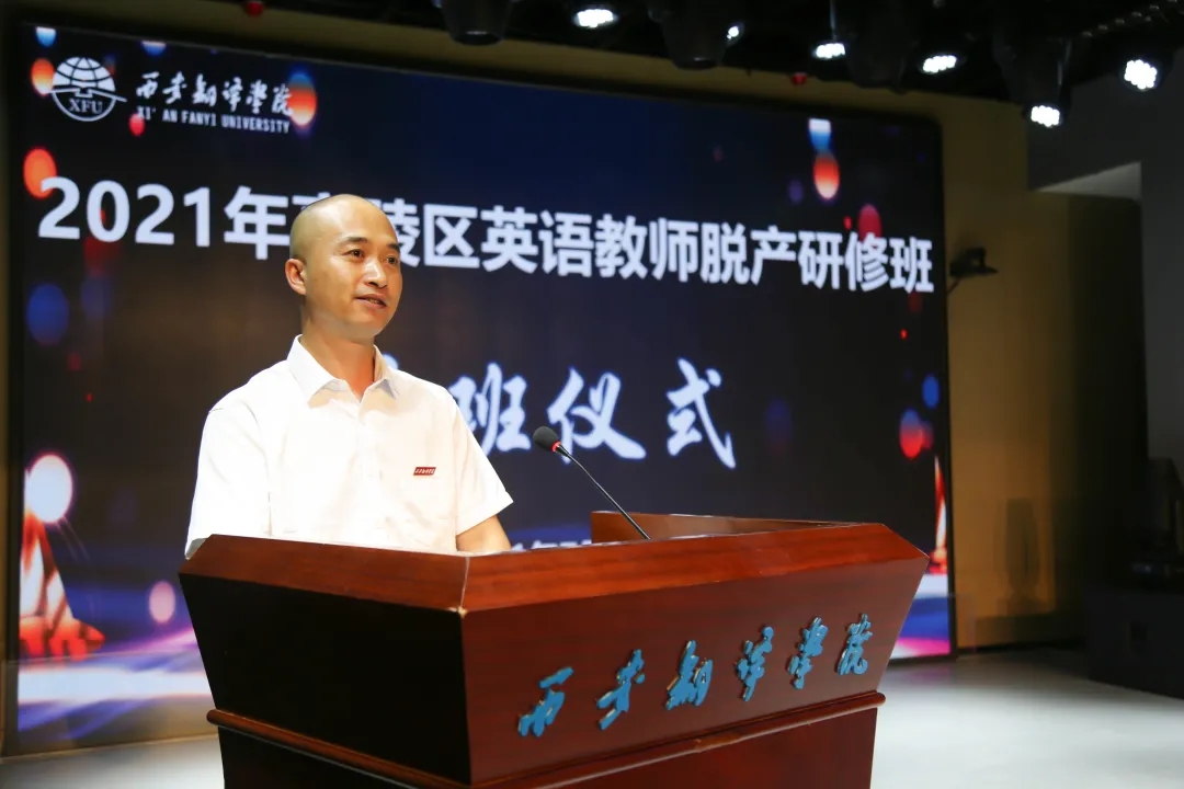 2021年7月26日上午,由西安市高陵区教育局主办,西安市高陵区教师进修学校、西安翻译学院承办的 2021 年高陵区中学英语教师脱产研修班,在西安翻译学院西区体验式教学中心报告厅举行了开班仪式。西安翻译学院党委副书记、副校长郭炜,高陵区教育局人事科科长左炜,西安翻译学院继续教育学院副院长刘远征,西安翻译学院培训学院培训科科长张乐,以及来自高陵区中学55名英语骨干教师参加了开班仪式。